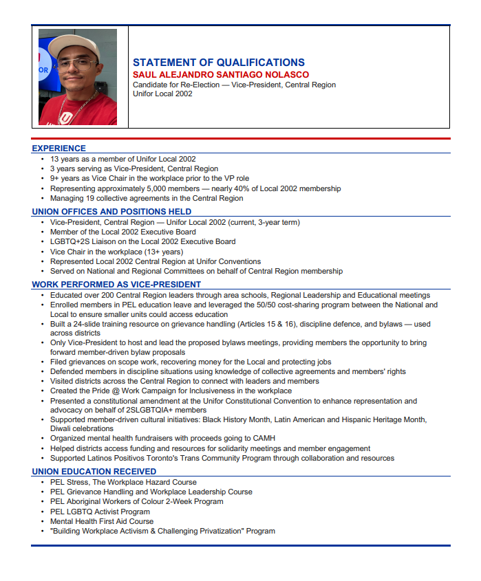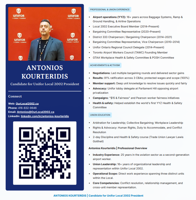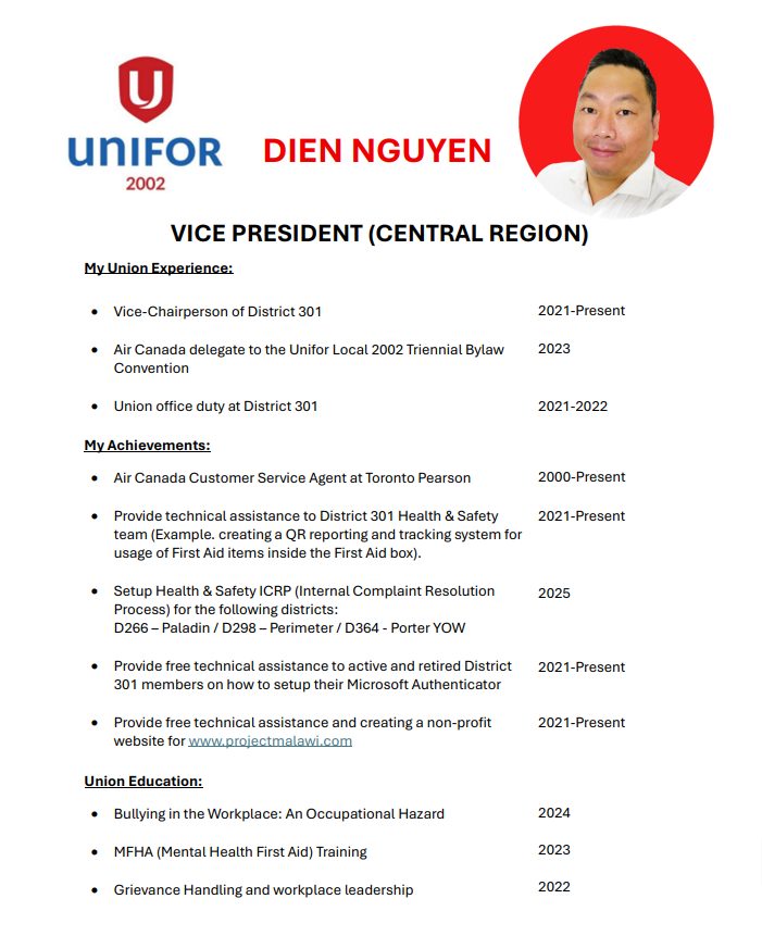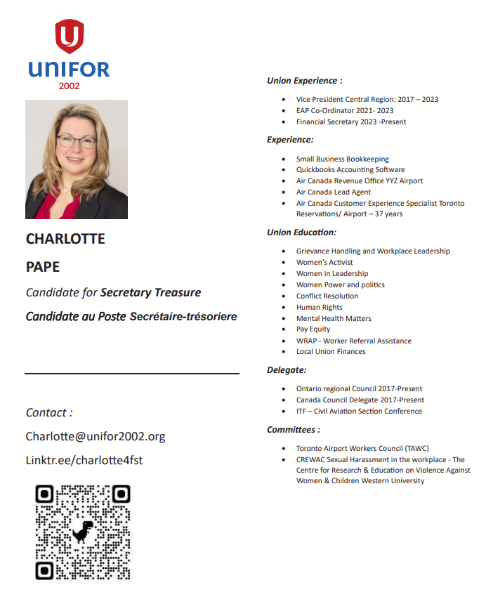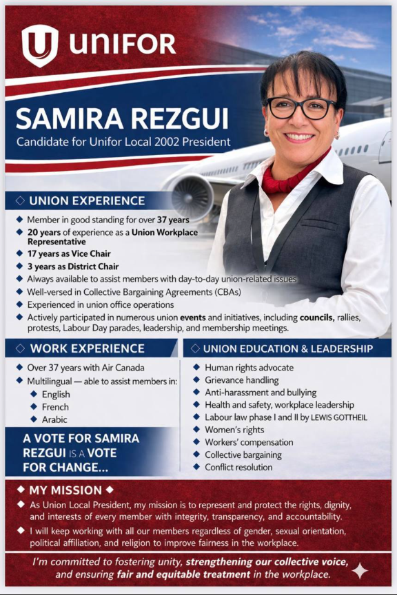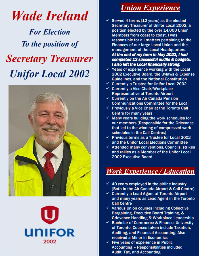 My education, years of experience in the Union, scheduling background, pension background, etc, built a good foundation. Having worked in both the Call Centre & Airport, with many years in the Leadership role, has given me a rounded work experience in the scope work covered by our Collective Agreement.