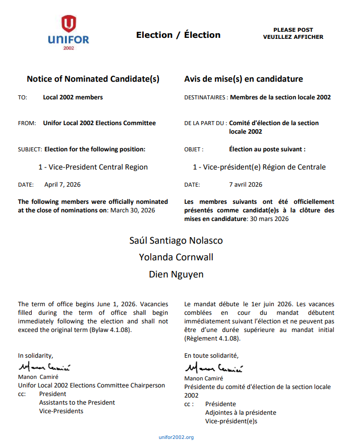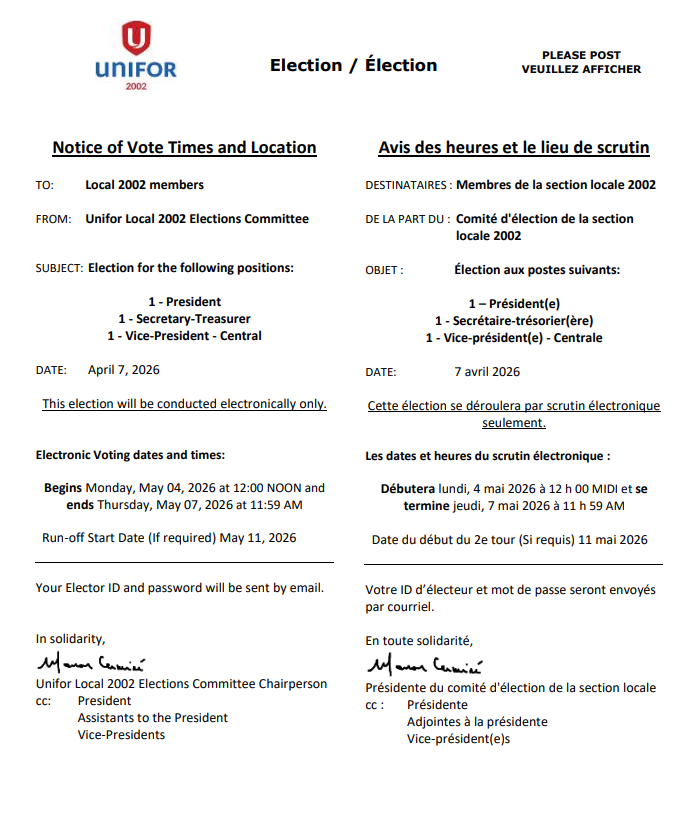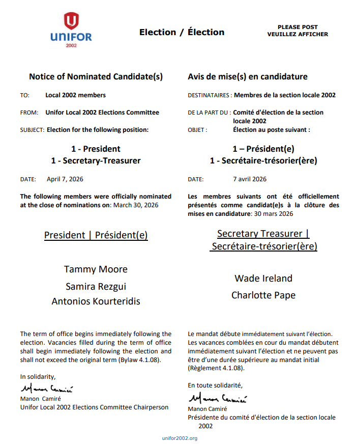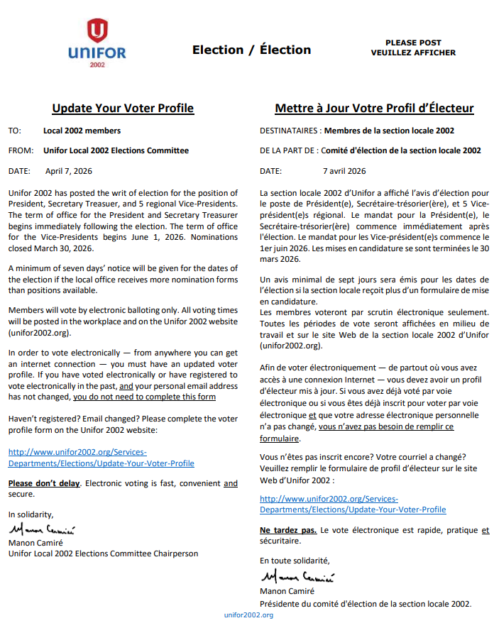 We will continue to keep you informed every step of the way with future bargaining updates issued from unifor2002.org as well from Unifor Local 2002 e-news messaging.